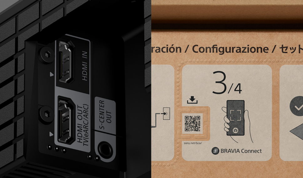 Para ayudar a las personas con limitación de la función visual a configurar los productos de audio en casa BRAVIA Theatre14, un marco cuadrado en el relieve del paquete contiene un código QR15 para la aplicación BRAVIA Connect16, que ofrece compatibilidad con lectores de pantalla. Los puntos táctiles en la parte posterior de los paneles de BRAVIA Theatre Bar 9 y 8 marcan los terminales eARC HDMI para conectarlos a un televisor.